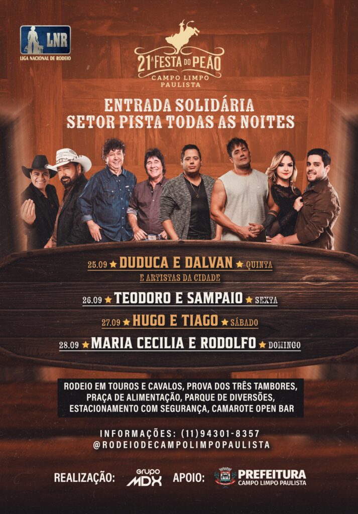A 21ª Festa do Peão de Campo Limpo Paulista é uma realização do Grupo MDX e Márcio Diniz, com o apoio da Prefeitura Municipal, e reafirma seu compromisso com a cultura sertaneja, o entretenimento de qualidade e a responsabilidade social.