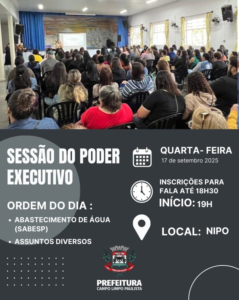 A Prefeitura de Campo Limpo Paulista informa que a Sessão do Executivo para tratar da crise hídrica será realizada hoje, quarta-feira, 17 de setembro às 19h, no NIPO.