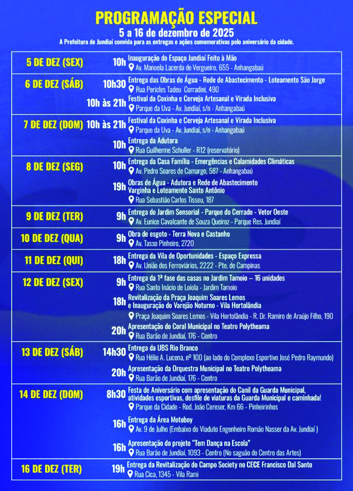 A agenda tem início nesta sexta-feira (5), com a inauguração do Espaço Jundiaí Feito à Mão, no Anhangabaú, e segue ao longo do final de semana com diversas entregas, além do Festival da Coxinha e Cerveja Artesanal, que ocorre simultaneamente à Virada Inclusiva, no Parque Comendador Antônio Carbonari (Parque da Uva). Nos dias seguintes, outras entregas importantes serão realizadas, entre elas a Casa Família – Emergências e Calamidades Climáticas, o Jardim Sensorial no Parque do Cerrado (Vetor Oeste), a Vila de Oportunidades no Espaço Expressa e a UBS Rio Branco. Já no dia 14, o domingo será marcado por festa, com a presença do Canil da Guarda Municipal, atividades esportivas e atrações culturais.
