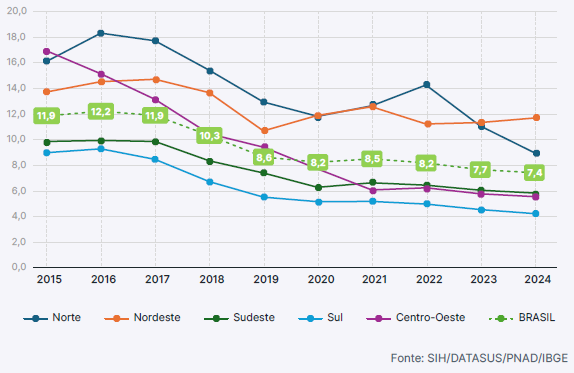 O Nordeste não acompanhou a redução observada nas outras regiões e hoje concentra o maior número e a maior taxa de internações, ele também possui o maior montante dos gastos com as internações hospitalares. A região responde por 42% das internações em 2024, ultrapassando em quantidade os registros do Sudeste, que representam 33%. A pesquisa mostra que quando são analisadas as taxas de internações, Norte e Nordeste registram as mais altas taxas, mais de duas vezes superiores às observadas nas outras regiões, demandando um olhar mais atento das gestões locais a esse tema. Porém, existe uma diferença entre as regiões, o Nordeste é a única região que teve crescimento da taxa entre 2022 e 2024, já o Norte reduziu 37% das internações neste mesmo período.