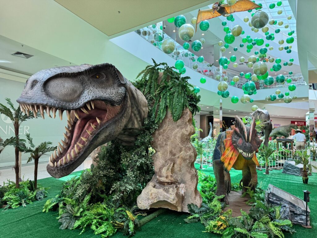 Espalhada pelo mall, a mostra conta com dez gêneros de dinossauros mecatrônicos, com movimentos e sons realísticos, além de espécies estáticas. Entre os destaques estão o Gigantossauro de 16 metros, o Dino Baby, um Dino Fantasia que circula pelo shopping, uma cabeça de dinossauro e dois ovos interativos e instagramáveis. Ademais, os pequenos de 03 a 10 anos ainda podem se divertir em um trenzinho temático, disponível na exposição.