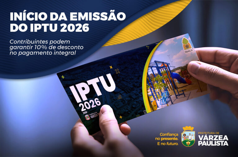 A Prefeitura de Várzea Paulista informa que o IPTU 2026 já está disponível para consulta e pagamento no site oficial do Município. Os contribuintes que optarem pelo pagamento integral, em parcela única, poderão obter 10% de desconto, com vencimento em 10 de março de 2026 — mesma data da primeira parcela para quem escolher o pagamento parcelado.