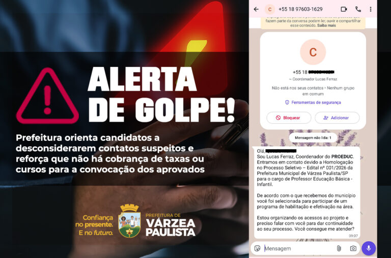 A Prefeitura de Várzea Paulista faz um alerta aos profissionais que participaram do Processo Seletivo da Educação Básica sobre uma tentativa de golpe.