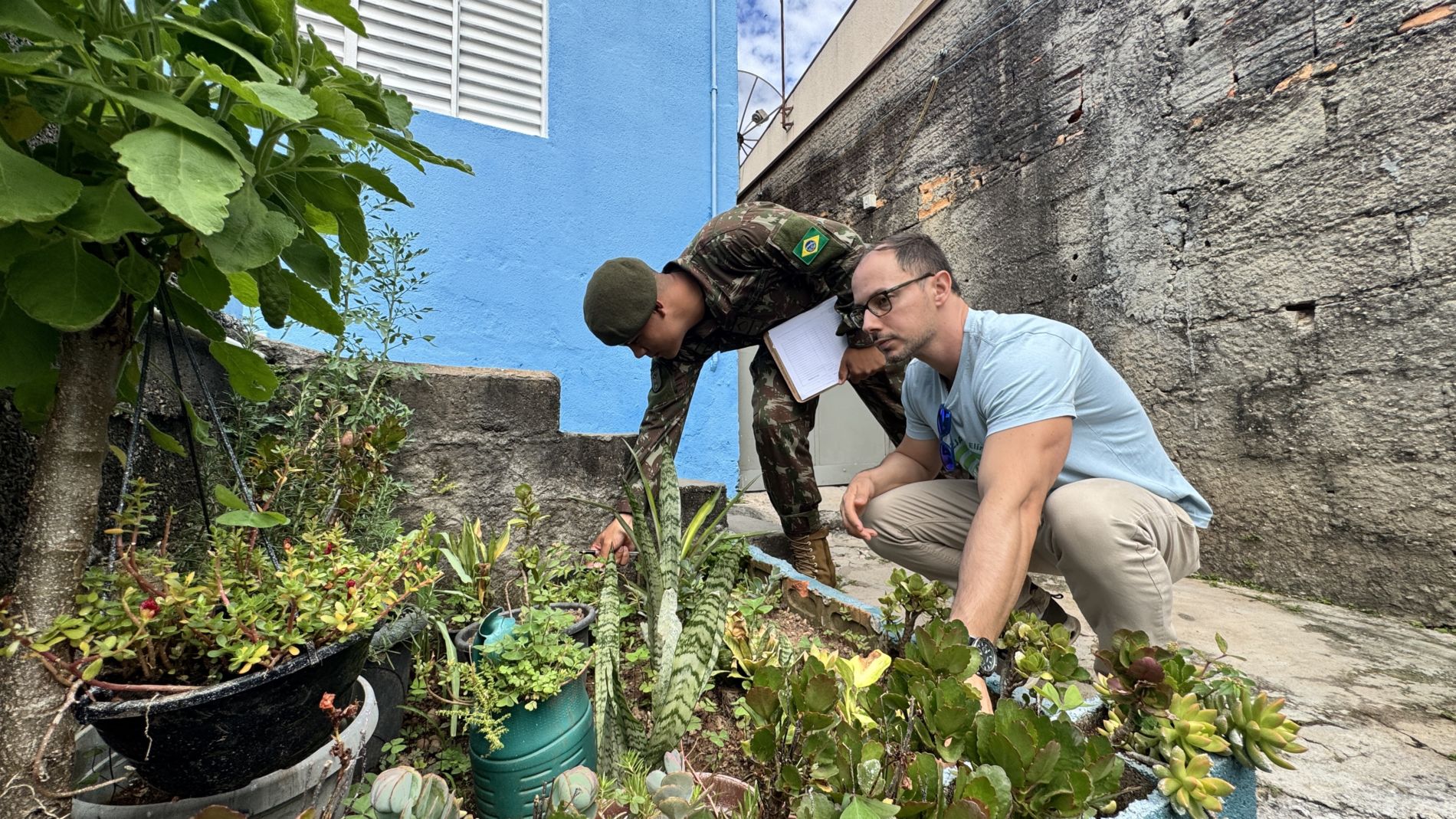 Técnicos da Vigilância em Saúde Ambiental (VISAM), junto com soldados do 12º Grupo de Artilharia Antiaérea (GAAAe), percorreram 800 imóveis de diversos bairros do município, orientando moradores, vistoriando quintais e eliminando possíveis criadouros do mosquito transmissor das arboviroses urbanas.