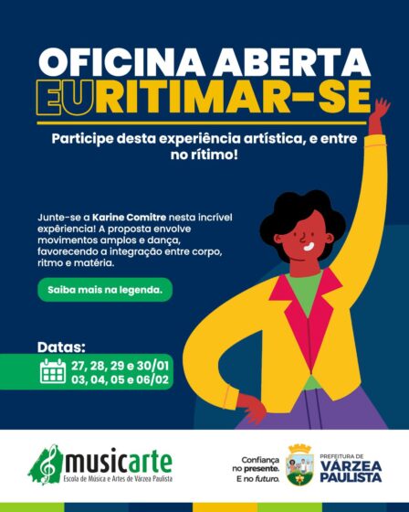 Encontros serão realizados em janeiro e fevereiro, na Musicarte. Inscrições abertas A Política Nacional Aldir Blanc (PNAB) promove entre os meses de janeiro e fevereiro, a oficina “Euritmar-se”, conduzida pela oficineira Karine Comitre, na Musicarte, em Várzea Paulista. A atividade será realizada nos dias 27, 28, 29 e 30 de janeiro e 03, 04, 05 …